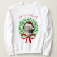 Este divertido suéter con temática navideña presenta una corona de Navidades hecha con huellas de pata verde y roja con una foto de un lindo gato dentro. La leyenda dice: ¡Navidades míseros! Puedes dejar la imagen del gato tal como está, o subir una de la tuya.
