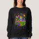 Elegante sudadera MARDI GRAS Coquette Masqerade en los populares colores violeta, dorado y verde. El diseño muestra varios elementos del Mardi Gras, como banner, máscara de mascarada, globos, coquetas, etc. La frase MARDI GRAS se repite en los mismos colores en el fondo en un formato de contorno. Sudadera ideal de Mardi Gras para usar en las calles de Luisiana, Nueva Orleans, Brasil y donde sea que se celebre el Mardi Gras. También disponible en blanco.