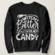Este diseño temático de Halloween presenta la frase lúdica "Mejor mujer que tenga mi dulce", arreglada en un diseño dinámico de fuentes mixtas. La palabra "Bruja" se muestra en letras en negrita y bloqueadas, mientras que "Mejor" se escribe en un guión cursivo y fluido, añadiendo un sentido de urgencia y diversión al diseño. La frase "Have My" se adjunta dentro de un cartel, haciendo mayor hincapié en la demanda. La palabra "Candy" se desmarca en la parte inferior en letras grandes y en bloque, con pequeños ilustraciones de cráneo integrados en el diseño. Otros elementos de Halloween, como el palo de bruja, un murciélago, una estrella y dulces envueltos, están esparcidos por toda la composición, lo que realza el sentimiento espeluznante y festivo.