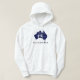 Una simple silueta blanca de un trineo de perro y la Cruz del Sur superpusieron en un mapa azul de Australia. Todo en un fondo estelar. ¿Quién lo hubiera pensado? Mushing boca abajo en Oz. El trineo de perros es bastante popular en Australia. En el Monte Hotham en Victoria hay una gran carrera cada año.