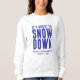 Camiseta divertida blanca y azul Es inminente una nevada para la despedida de soltera de invierno / esquí. Personalízala con los detalles de tu evento y cambia los colores.