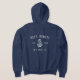 Muestra tu estatus de capitán (o primer oficial) con este diseño personalizado genial. El estilo náutico clásico incluye el nombre del barco, el año de nacimiento y el registro del barco con letras blancas rústicas y un ilustracion de ancla. El diseño aparece en el área del bolsillo delantero y en la parte posterior.