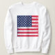 La sudadera pullover básica de las mujeres se muestra en blanco con una huella gráfica patriótica de la bandera de los Estados Unidos, perfecta para el 4 de julio o cualquier otro momento patriótico, esta sudadera está hecha de materiales de calidad y artesanía y está disponible en más colores. Personalizar a tu tamaño, colores, agrega texto a tu gusto; o compra como está.