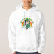 Hoodie con el Ilustracion de un lindo leprechaun sonriente usando un traje verde, un sombrero top mientras sostiene una hoja de shamrock, con un arco iris colorido en el fondo y un texto que dice "Feliz Día de San Patricio" Un diseño perfecto para celebrar el Día de San Patricio, dibujado por Radka2D