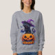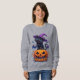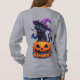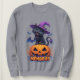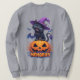 Playful black cat wearing a purple witch hat sits inside a carved jack-o'-lantern pumpkin above bat wings and bold text — a funny, festive Halloween art for seasonal designs.