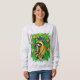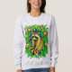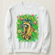 La sudadera de un lindo mapache se sienta en medio de un jardín, enmarcado por hojas verdes brillantes, margaritas amarillas y tulipanes rosas. Los colores llamativos y los detalles lúdicos le dan al diseño un ambiente divertido y animado, mezclando el encanto de los bosques con una ráfaga de color jardín.