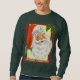 Un encantador y anticuado Papá Noel de la época victoriana, este padre de Navidad vintage tiene mejillas rojas brillantes, una gran barba blanca, arbustiva y un brillo en los ojos. Detrás de él hay un patrón tradicional de tartán verde y rojo, un arco de satén verde y un saludo navideño a Feliz bajo él.