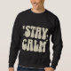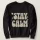 La frase "MANTÉNGASE CALMA" se presenta en un tipo de letra retro, burbujeante, con acentos de estrellas juguetonas, que evocan la era de los movimientos de paz de los años 60-70, posters psicodélicos y una contracultura optimista. Las suaves letras en crema sobre el fondo oscuro hacen que las palabras destaquen casi como un recordatorio brillante en la noche.