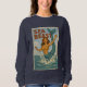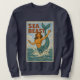 This Sea Beast mermaid is making a splash as she leaps exuberantly out of the water, with her jewel colored tail and shell bra. The humorous twist on retro coastal poster art was created to make you smile. This lighthearted sweatshirt is a great way to add seaside vibes to your outfit. | Pro-Tip: For vibrant colors we recommend vivid printing for most apparel. For white apparel select classic printing.