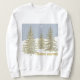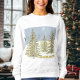 A familiar, Holiday greeting, has been digitally-edited, to create this, graphic drawing, of guilded-gold, trees, grouped together, upon a snowy, backdrop-with glowing, Symbolic, Holy Star, against a slate-blue, sky.