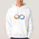 Símbolo claro de infinito de capas plásticas de colores saturados rojo, amarillo, verde, turquesa, azul y violeta sobre fondo blanco.