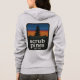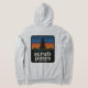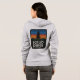 Womens Bella Canvas grey zip up hoodie, scrub pines and medford lakes on front pocket, sunset logo on the back