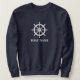 Su nombre o nombre personalizado del barco con casco de rueda náutico en la camisa azul de la marina.