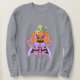 The man is wearing a light gray crewneck sweatshirt. The shirt features a large, colorful, and cute Halloween graphic in the center. The graphic depicts a skeleton with a pink and purple ribcage, wearing a cape and a large purple bow, and topped with a carved jack-o'-lantern head adorned with a green stem hat and white flowers.