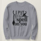Este clásico diseño de Halloween presenta la espeluznante frase "Te pongo un hechizo" en una letra audaz de inspiración gótica. El blanco y el negro crean un ambiente sobrio, por lo que el diseño es perfecto para la temporada de Halloween. Acompañando el texto hay elementos de bruja icónica, incluyendo un gorra de bruja puntiaguda, un palo de escoba, una telaraña y una araña diminuta, todos dispuestos para crear una composición fascinante. El sutil detalle de los puntos alrededor del texto añade un toque de encanto mágico.