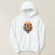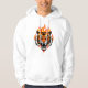 Cabeza de tigre estilizada, representada en colores audaces y un diseño dinámico. El tigre tiene rayas naranjas y negras llamativas, con ojos amarillos intensos que transmiten una expresión feroz. Alrededor de la cabeza del tigre hay llamas en tonos vibrantes de amarillo y naranja, que realzan el sentido de poder y energía. La composición general es agresiva y enérgica, con un enfoque en los dientes afilados y las características poderosas del tigre, lo que sugiere un tema de fuerza y ferocidad.