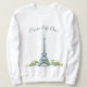 Esta sudadera presenta una pluma original y caprichosa y un dibujo de tinta de la Torre Eiffel en París Francia. El texto dice "¡Paris Life Oui!" Copyright Leah Wiedemer