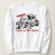 Sudadera Trump Sacando La Basura. © Tees & Sweats en Zazzle. Esta sudadera tiene una imagen de Trump en un camión de basura con varios demócratas en bolsas y contenedores de basura al lado. Las palabras Sacando La Basura están en rojo.