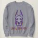 El logo de la mascota de la Universidad de Albany Great Dane muestra una elegante representación de la cabeza de un Gran Danés. El perro está ilustrado con líneas agudas y audaces en morado y gris, dándole una expresión feroz y segura de sí misma. Las orejas se sostienen alto, simbolizando la alerta y la fuerza. Debajo de la cabeza del Gran Danés está la palabra "UAlbany" escrita en letras de oro audaces y bloqueadas, delineadas en morado, reforzando la marca de la universidad. Este diseño representa a los equipos deportivos de la UAlbany, destacando el poder, la lealtad y la determinación.