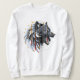 La imagen es un ilustracion digital que presenta la cabeza de un lobo estilizado con una expresión agresiva, mostrando dientes afilados y una mirada feroz. La piel del lobo está pintada en tonos negros, blancos y grises, con acentos dorados y rojos que aportan un contraste dinámico y vibrante.