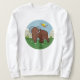 Un mamut marrón y lana mira al espectador. Ha levantado colmillos, abrigo peludo, ojos y oreja pequeños y un gran baúl largo.