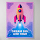 Inspira mentes jóvenes con nuestro cartel "Sueña en grande, apunta alto", que presenta un cohete lanzándose al espacio. Este vibrante y motivador arte mural es perfecto para guarderías, salas de juegos o aulas de niños. Los colores llamativos y el mensaje alentador animan a los niños a alcanzar las estrellas y creer en sus sueños. Una excelente adición a cualquier decoración temática espacial o como un regalo considerado para pequeños aventureros listos para explorar el universo de posibilidades. ¡Que este cartel sea un recordatorio diario para soñar en grande y apuntar alto!