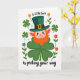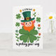 Esta tarjeta muestra a un simpático duende de dibujos animados asomándose desde detrás de un trébol de cuatro hojas de gran tamaño, como si se inclinara con una sonrisa de conspirador para un amigo cercano 💚. Lleva un sombrero alto verde oscuro con una hebilla dorada, y sus ojos como puntos, mejillas sonrosadas y amplia sonrisa le dan un aspecto fácil y acogedor. Una barba naranja brillante enmarca su rostro, y sus orejas puntiagudas añaden un toque descarado que se siente como un guiño a través de la habitación. El fondo permanece blanco y aireado, haciendo que los verdes y naranjas resalten mientras pequeños tréboles y florecillas silvestres se dispersan alrededor como confeti ligero de primavera ☘️. Esas pequeñas flores añaden toques de rojo, amarillo y azul, formando un borde de prado suelto que mantiene la escena con un ambiente abierto en lugar de abarrotado. Cerca de la parte superior, la frase “Un poco de suerte se asoma en tu camino” aparece en letra cursiva fluida, en verde para que se relac