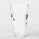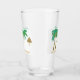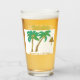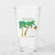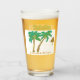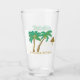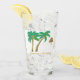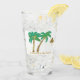 Dibujo mosaico, gráfico, de una isla, con dos cocoteros, y cabaña, con la frase "Summering In The Tropics", en colores verdes, amarillos, turquesa, azul, taupe, marrón y negro.