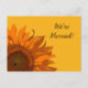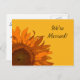 Anuncie su reciente matrimonio privado o fuga secreta con el Naranja Sunflower en la tarjeta postal de la Invitación matrimonial amarilla. Personalizar con los nombres personales de los recién casados, fecha de la ceremonia de boda y lugar. Perfecto para una boda elegante de primavera, verano o otoño. Esta alegre tarjeta personalizado de invitación botánica matrimonial presenta una fotografía floral realzada digitalmente de un girasol naranja sobre un fondo amarillo dorado.