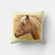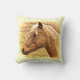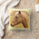 Esta almohada de tiro presenta un hermoso caballo marrón dorado retroiluminado por el sol amarillo.