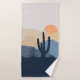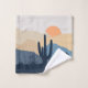 Desierto mexicano al amanecer ilustracion con sol, montañas y cactus decoración en tonos azul marino, naranja, azul y beige sobre fondo gris pastel