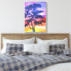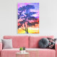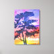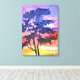 Hermosa y colorida puesta de sol soñadora pintura del artista Sacha Grossel de un paisaje amarillo rojo y violeta de puesta de sol en el exterior con una sombra de árbol en primer plano. Arte original colorido al estilo acuarela.