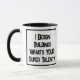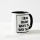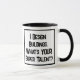 Divertido eslogan en una taza que dice "Diseño Edificios. ¿Cuál es TU super talento?". Taza Dos Tonos para un Arquitecto. Texto negro y blanco en negrita.