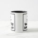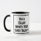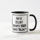 Divertido eslogan en un tazón de café de dos tonos que dice "Soy un Cellista. ¿Cuál es TU supertalento?". Dos tazas de café para un Cellista o alguien que toca el cello. Texto en negrita en blanco y negro.