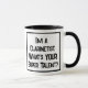 Divertido lema en un tazón de café de dos tonos que dice "Soy Clarinetista. ¿Cuál es TU supertalento?". Dos tazas de café para un Clarinetista o alguien que toca el clarinete. Texto en negrita en blanco y negro.