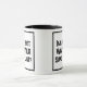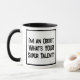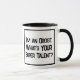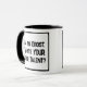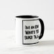 Divertido lema en un tazón de café de dos tonos que dice "Soy un boísta. ¿Cuál es TU supertalento?". Dos tazas de café para un boísta o alguien que toca el oboe. Texto en negrita en blanco y negro.