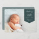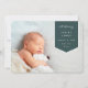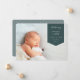El simple anuncio moderno de nacimiento presenta una única foto horizontal o orientada al paisaje con un cartel en la parte superior derecha, con el nombre del bebé, la fecha de nacimiento y las estadísticas de nacimiento. Añade un mensaje personal a la parte posterior, junto con tres fotos cuadradas adicionales.