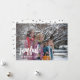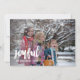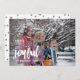 Tarjeta de felicitación de Navidad mágica con ráfaga de nieve y superposición de texto con confeti plateado en el reverso.