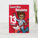 Esta tarjeta dice Superstar Nephew 13 hoy. Adentro: Feliz cumpleaños o puedes personalizar con tus propias palabras. Niño de pelo oscuro y divertido tocando su tarjeta de guitarra eléctrica con arte original y diseñado por Sarah Trett para www.mylittleeden.com