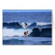 Los surfistas recorren las olas de la costa de la Gran Isla de Hawaii. En la parte trasera de la tarjeta, una mujer surfista conduce una tabla a la playa.