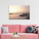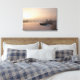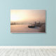 Paisaje de lienzo impreso de un amanecer sobre un canal helado con nieve y un bote con algunos molinos de viento en invierno en Kinderdijk en los Países Bajos.