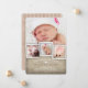 Casual y elegantemente rústico, este fondo beige de burrega y elegante tipografía preparan el escenario para un encantador anuncio de nacimiento de su recién nacido chica. Con espacio para un collage de fotos de su hijo, esta tarjeta es una manera encantadora de presentar al bebé a su familia y amigos. Burlap de coordenadas y patrón rayado rosado en la parte posterior.
