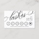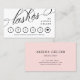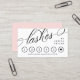 Elegante tarjeta de fidelidad para tu negocio de latigazos con latigazos escritos en un guión rápido a través de la portada. Añade tu nombre también. La tarjeta de fidelidad es para la sexta visita o tratamiento con descuento, con un corazón negro marcándolo. Escriba su nombre, negocio e información de contacto en la parte posterior con texto negro en un fondo rosa rubor.