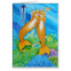 Dos mesas de sirena nadando bajo el mar con peces dorados.