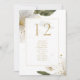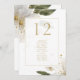 Estas tarjetas de moda y elegante número de mesa boda y de asiento para invitados cuentan con un número de tabla personalizado y una lista de asientos para invitados editables. Un conjunto contemporáneo de fuentes, un bonito diseño de acuarela de follaje floral y una superposición con el borde dorado de imitación, le dan un toque contemporáneo y elegante. Tanto la parte delantera como la trasera de la tarjeta son idénticas para facilitar su visualización.