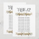 Tabla de asientos de mesa con número de tabla y lista de invitados para esa mesa - impreso en ambos lados para crear un plan de asientos colgantes o para pararse en las mesas del comedor. El diseño presenta una tipografía elegante y guirnaldas festivas con adornos dorados. Para coordinar invitaciones, papelería y decoración del día del evento, por favor visite mi Colección de Bodas de las campanas negras o envíeme un mensaje para añadir cualquier artículo adicional que necesite.