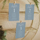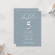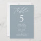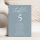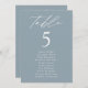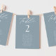 Elegante gráfico de asientos de bodas con "mesa" mostrada en escritura de caligrafía blanca con el número de la tabla y los nombres de invitados mostrados abajo en un polvoriento fondo azul. El diseño se repite en la parte posterior. Para ordenar el gráfico de asientos de número de tabla, edite cada tarjeta con el número de tabla y los nombres de invitados y agréguela a su carrito. Diseñado para coordinar con nuestra colección de bodas Modern Elegance.