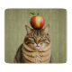 Un gato gracioso con una manzana balanceándose encima de su cabeza.