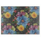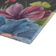 Una bonita tabla de corte rectangular tiene grandes flores azules primarias pintadas con otras más pequeñas de color amarillo caléndulo, violeta y rosa, todo ello sobre un fondo gris de carbón vegetal que le da un aspecto oscuro y elegante. Artículos de juego disponibles para cama, baño y en todo el hogar