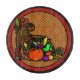 Esta Charcuterie de Acción de Gracias presenta un diseño rústico de color verde oliva pálido y fondo de manteca roja, detrás de una vidriera que luce cornucopia de mimbre llena de frutas y verduras frescas cosechadas, y doble frontera exterior (manteca roja y negro sólido). Vea la coordinación de productos de la artista digital Leslie Sigal Javorek en HoMeArts.